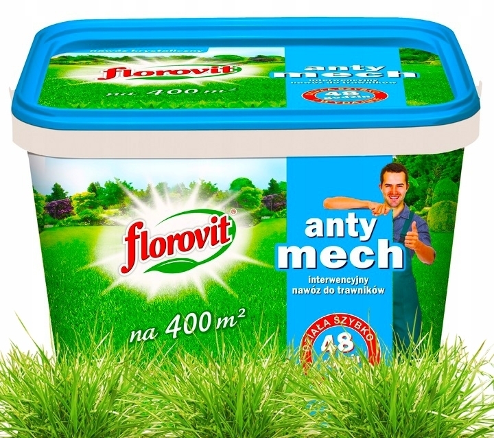 Florovit ANTY MECH nawóz interwencyjny do trawników, jest bardzo skuteczny oraz bardzo wydajny, został przeznaczony do wszystkich rodzajów trawników wieloletnich, na których występuje mech. Nawóz wspiera utrzymanie soczyście zielonej, dobrze wybarwionej, gęstej i zwartej darni trawnika, a jednocześnie skutecznie pozbywa się niechcianego mchu. Działa bardzo szybko, pierwsze efekty już po 48 godzinach od zastosowania.