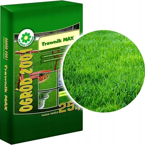 OGRÓD 2001 Trawnik Max jest specjalistycznym wysokoskoncentrowanym nawozem ogrodniczym przeznaczonym do nawożenia trawników. Duża zawartość azotu zapewnia nawożonym trawnikom intensywne zielone wybarwienie. Zawarte w nawozie żelazo oraz wapń przeciwdziałają porostowi mchu, Nadaje się do nawożenia wszystkich odmian traw, szczególnie trawników ozdobnych, reprezentacyjnych i intensywnie używanych (boiska).