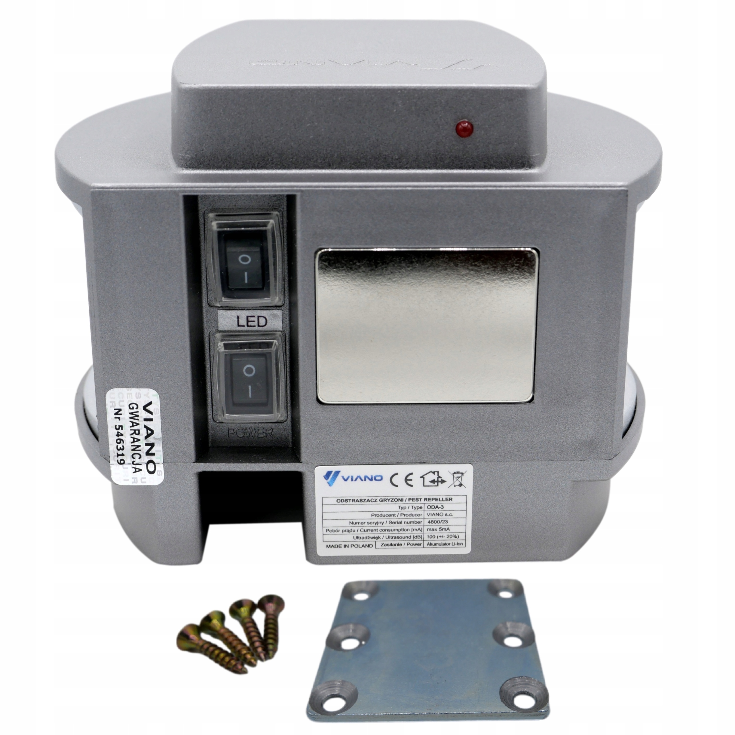 - Mocny energooszczędny generator ultradźwięków z modułem automatycznej zmiany częstotliwości. Urządzenie emituje podlegający zmianie ultradźwięk, który wytwarza dla gryzoni nieprzyjemne, nieznośne środowisko, uniemożliwiając im tym samym przebywanie i osiedlanie się w pobliżu chronionej przestrzeni.