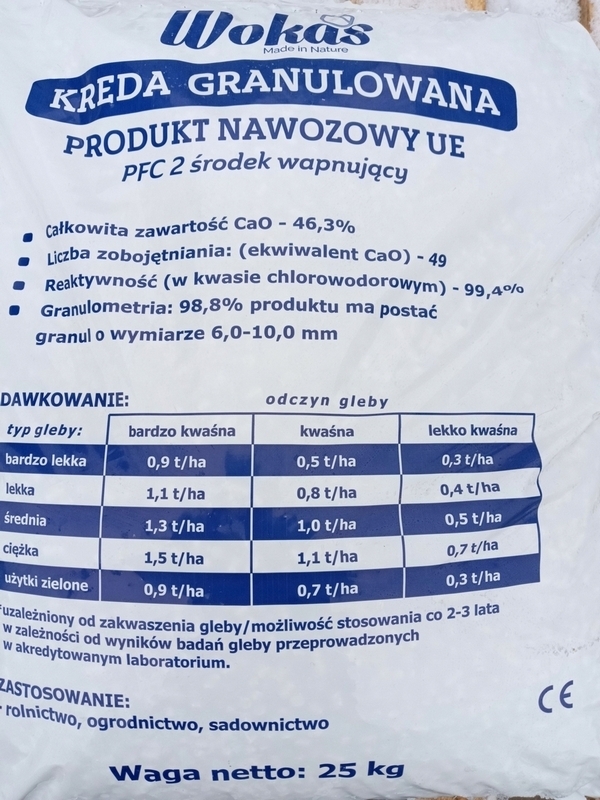 - Zmniejsza nakłady na zabiegi agrotechniczne – nie trzeba jej mieszać z glebą. Kreda jest dostępna zarówno w formie kredy surowej oraz równie szybko rozpuszczalnej formie granulowanej, w tym również w połączeniu z magnezem i siarką. Dzięki takiemu połączeniu niedobory tych ważnych dla roślin mikroelementów w glebie są skutecznie i szybko uzupełniane.