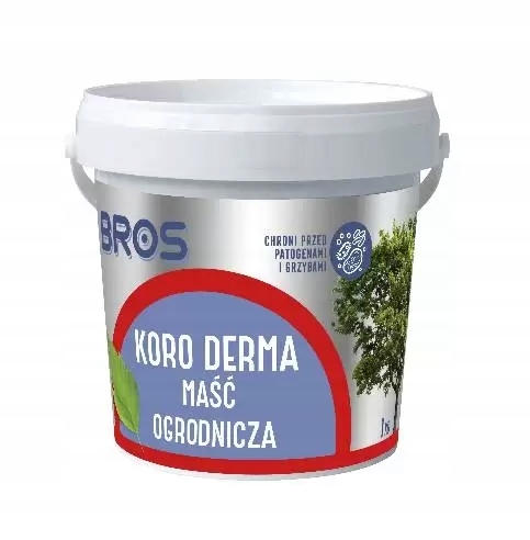 Bros 1kg Koro Derma Maść ogrodnicza na rany kory ochronna po cięciu gałęzi Maść ogrodnicza przeznaczona do zabezpieczania ran drzew i krzewów, powstałych podczas szczepień, uszkodzeń mechanicznych, otarć, pęknięć pod wpływem mrozów, szkód wyrządzonych przez dzikie zwierzęta itp. Tworzy trwałą i elastyczną powłokę odporną na działanie czynników atmosferycznych. Koro-Derma chroni także przed wysychaniem oraz przyspiesza gojenie i zabliźnianie się ran. Preparat zabezpiecza uszkodzone miejsca przed infekcjami wywołanymi patogenami i grzybami.